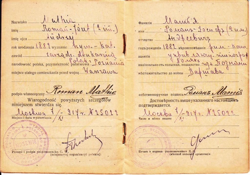 Another surviving document is Roman’s ID, issued in 1917 in Moscow by the Central Department for the Care of Civilian, War and Administratively exiled prisoners. It is worth paying attention to the entry of Polish citizenship there and Roman identifying himself as a Pole from Poznań, even though he was still formally subject of the Prussian king with his ancestors from Warmia (although his one grandmother was actually from Greater Poland).