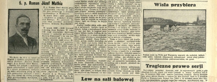 In his non-professional activities, Roman was also active in the Warsaw Rowing Association, which in 1927 was renamed as the “Wisła” Rowing Club. He played the flute at home. Roman Mathia died at the Holy Ghost Hospital in Warsaw on April 6, 1932, according to a family report of lead poisoning, an occupational disease of printers.